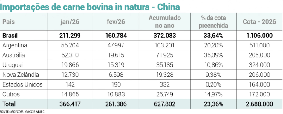 O ritmo acelerado das exportações brasileiras de carne bovina para a China reacendeu a pressão do setor frigorífico sobre o governo federal para a criação de um mecanismo de controle dos embarques. Dados oficiais compartilhados pelo Ministério do Comércio (MOFCOM) e a Administração Geral das Alfândegas da China (GACC) indicam que 33,6% da cota anual já foi utilizada apenas no primeiro bimestre de 2026, cenário que preocupa empresas e entidades do segmento.